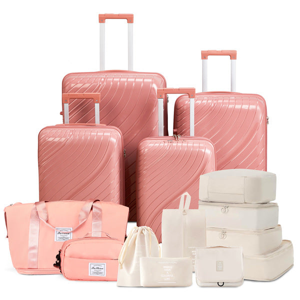 4-Piece Luggage Set with 2-Piece Handbag & 8-Piece Toiletry Kit – Rose Gold PP Suitcase + Beige Travel Accessories