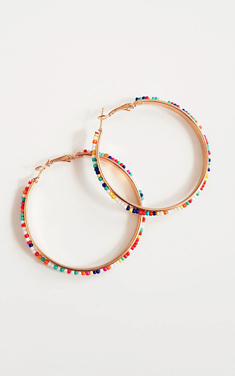 our SONIA earrings feature gold plating, all over beaded design and loop clasp backing.
