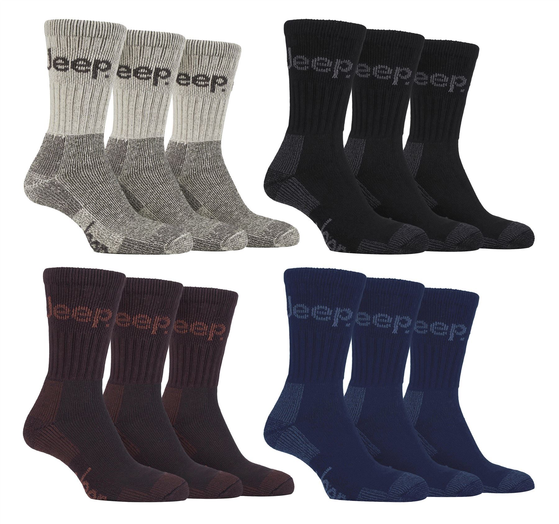 Seriously chunky, these heavyweight terrain socks by Jeep are cotton rich for long-lasting durability. One size 6-11 Mens. Ready to be put through their paces, this 12 pair pack of luxury men's socks each have a ribbed ankle and cushioned heel, sole and toe.