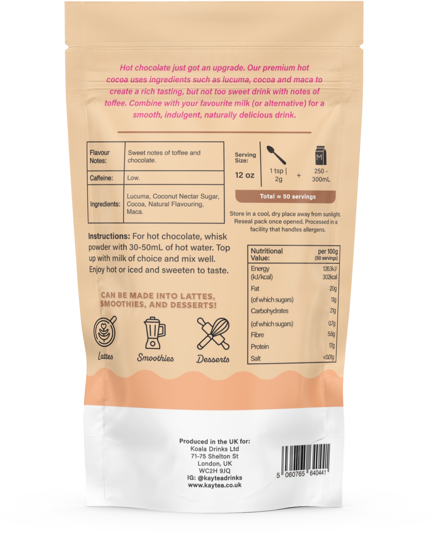 ***A note to our lovely European customers: This is not a traditional Hot White Chocolate that you would get from a Christmas market. We use raw cocoa and lucuma, providing a much more natural, healthy, and vegan drink!Hot chocolate just got an upgrade. Our premium Hot chocolate latte uses ingredients such as lucuma, raw cocoa and coconut sugar to create a rich tasting, but not too sweet drink with notes of toffee and vanilla. Combine with your favourite milk (or alternative) for a smooth, indulgent, naturally delicious drink. Lucuma used in this chocolate blend is a type of fruit native to Peru and is often touted as a rich source of nutrients including beta-carotene, vitamin B3, iron, zinc, calcium, magnesium, and other vitamins and minerals. It also contains protein, antioxidants, and dietary fibre. It may offer several benefits, such as regulating blood sugar levels, improving heart health, and providing a powerful dose of beneficial antioxidants.We use real, finely grounded natural ingredients so they may not dissolve completely in your drink. As there are no artificial fillers, 100 grams make approximately 50 servings.*A few of our customers use this to flavour their coffee, which we think is a brilliant idea!Ingredients: Lucuma, Coconut Nectar Sugar, Cocoa (17%), Natural Flavouring.Flavour Notes: Sweet notes of toffee and vanilla.Caffeine: Low.