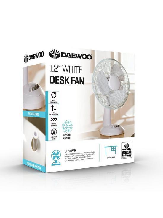 The Daewoo 12-inch Desk Fan keeps you cool as you work or relax. STAY COOL The compact Daewoo 12-inch Desk Fan maximises air circulation to quickly cool down your room or office. The fan head oscillates and tilts enabling you to direct the fan comfortably in any direction. It also features triple blades to produce powerful airflow that helps you stay focussed at your desk. Ideal for homeworking. 3 SPEED SETTINGS Easily adjust the cooling intensity with a selection of High, Medium or Low speed, with easy access to the controls built into the base.