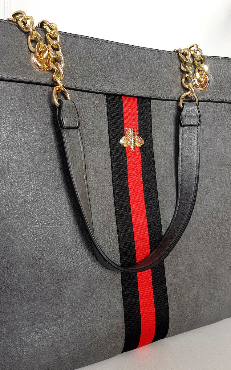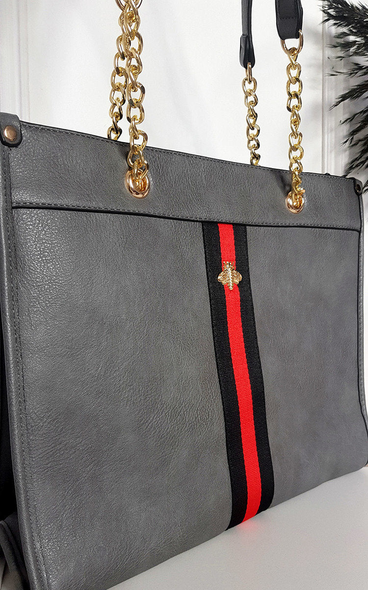 Faux Leather Chain Shoulder Bag with Stripe Detail