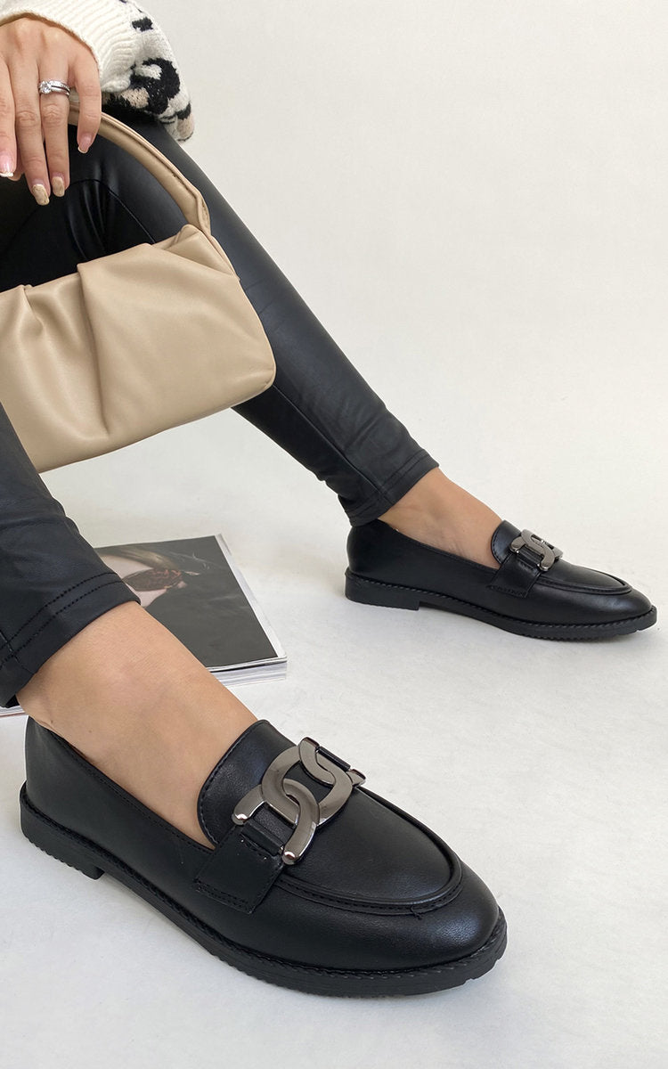 Introducing our brand new Harriet Faux Leather Flat Shoes with Chain Detail! Our newest addition to the ikrush flats collection, these shoes are perfect for dressing up or down! Made from high quality faux leather, they feature a pointed toe and a dainty chain detail across the vamp. dress them up with a pretty dress and statement earrings for your next special occasion, or keep it casual with jeans and a tee. Either way, you'll be sure to turn heads!