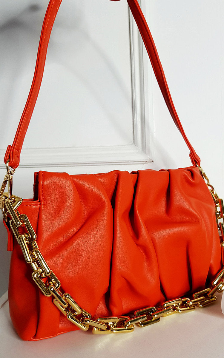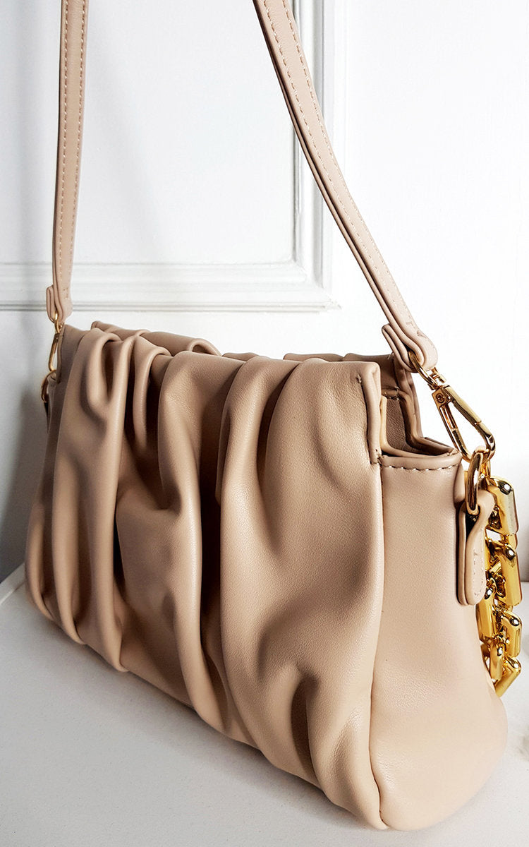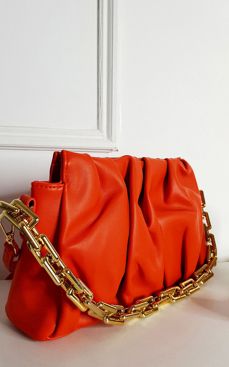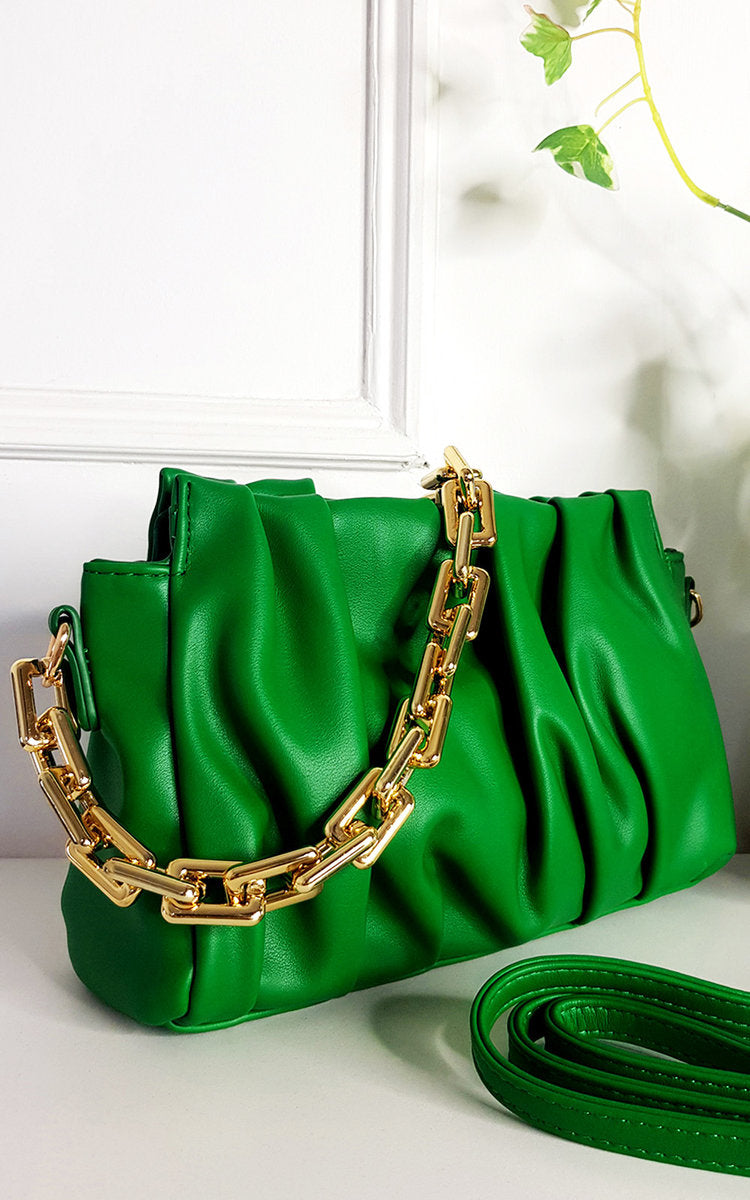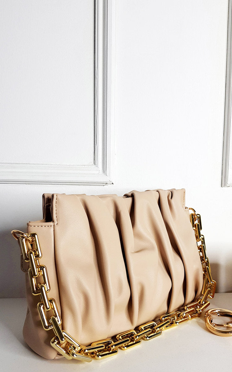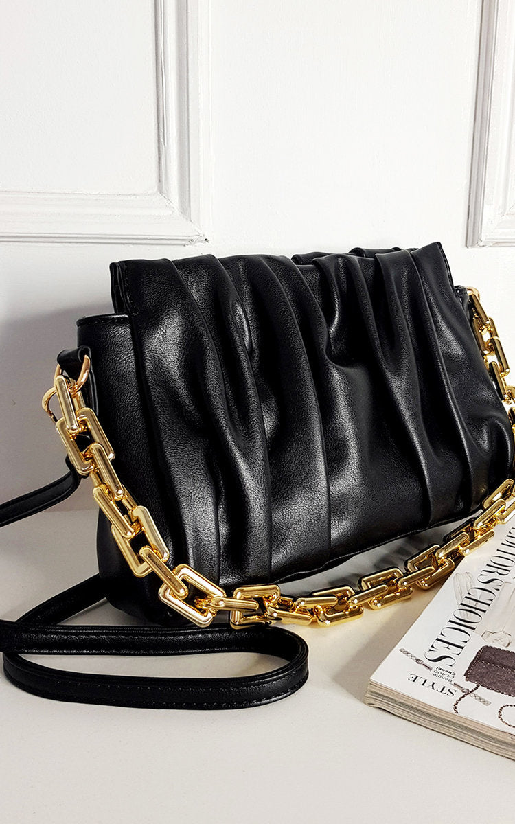 Get the fashionable and classy look with this Klara bag! One of its best features is it's cute scrunched texture. Paired with a chunky gold chain strap and smooth faux leather material, you're set for your night out.