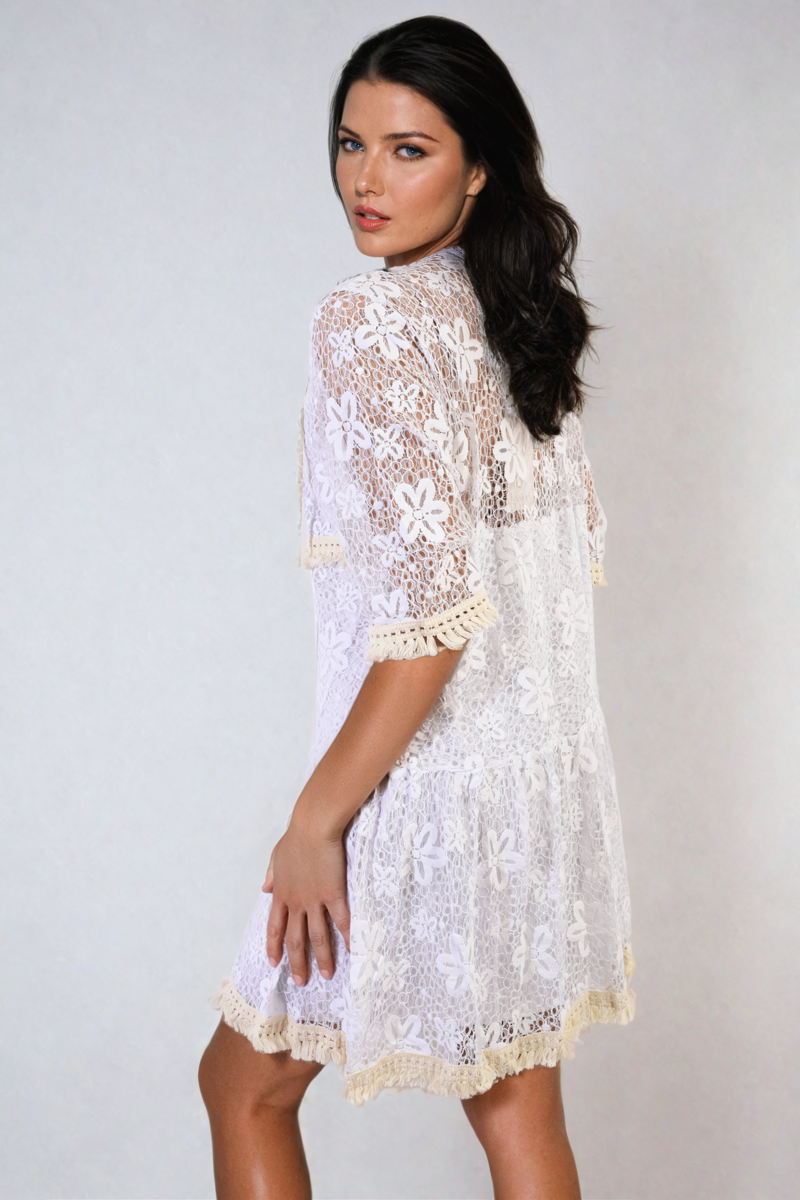 The Loretta Floral Lace Tassel V-Neck Mini Dress is a charming and playful option. It features delicate floral lace, a flattering V-neck, and fun tassel details. Perfect for a fun day out or a casual evening, this mini dress adds a touch of elegance and whimsy to your look.