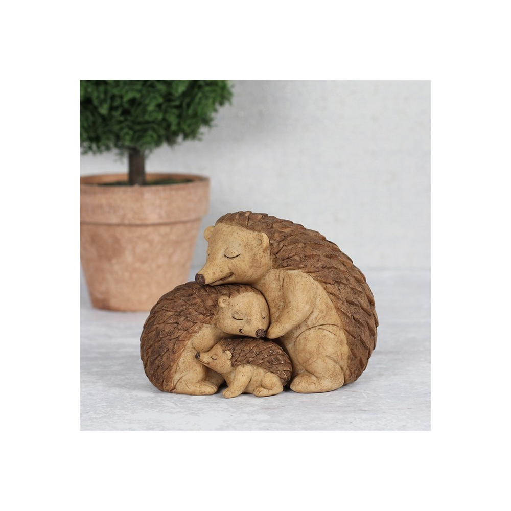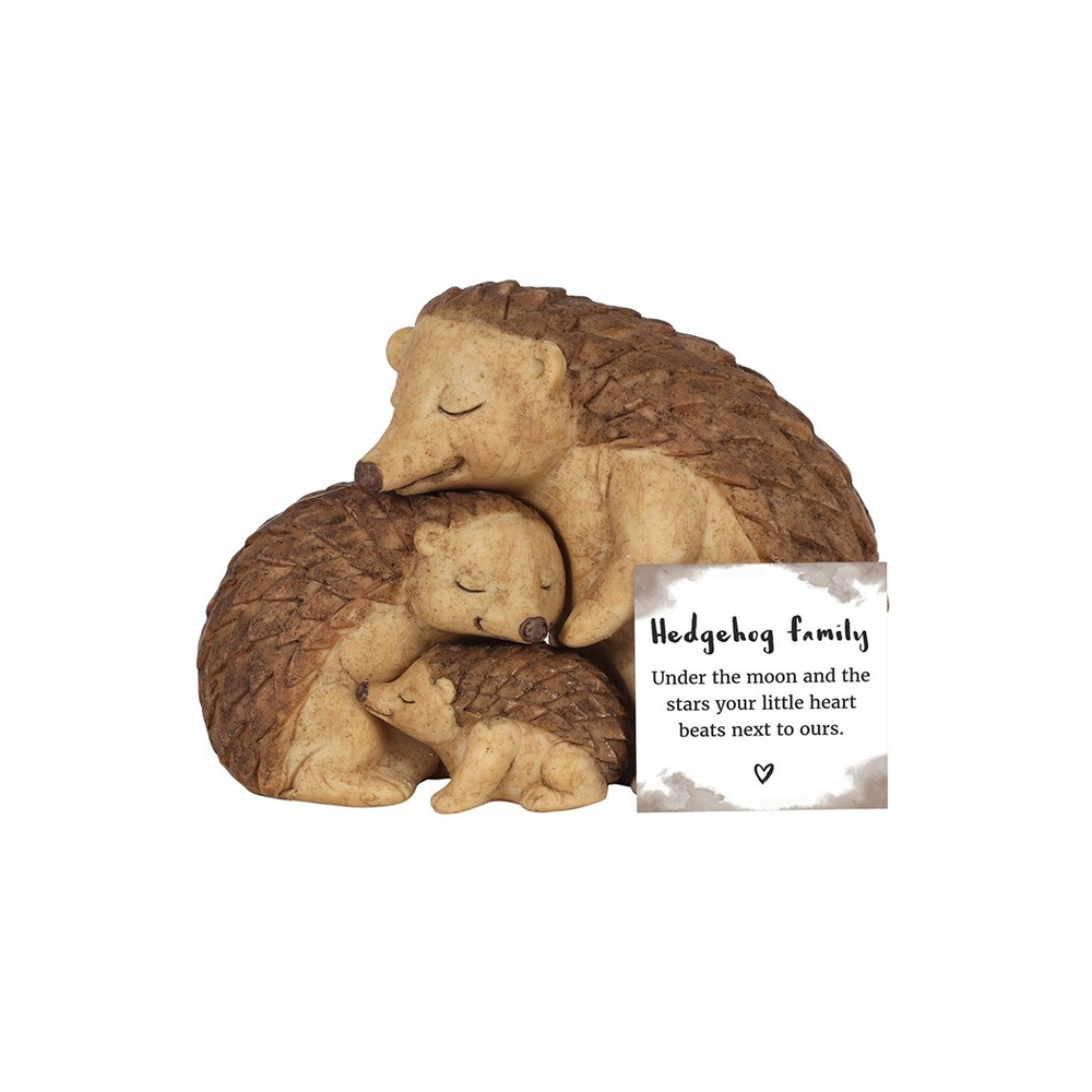 This lovely Hedgehog Family ornament shows a loving embrace between two parent hedgehogs and their baby. Complete with printed sentiment card which reads, 'Under the moon and the stars your little heart beats next to ours'.Product Dimensions: H8cm x W11cm x D6cm Packaged Dimensions: H10cm x W14.5cm x D8cm