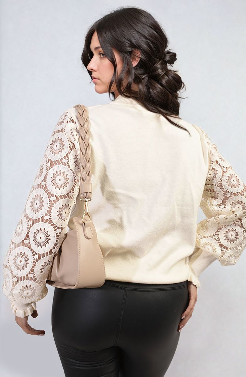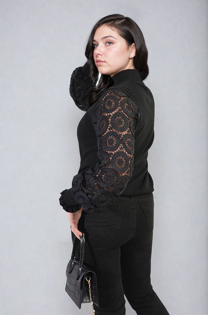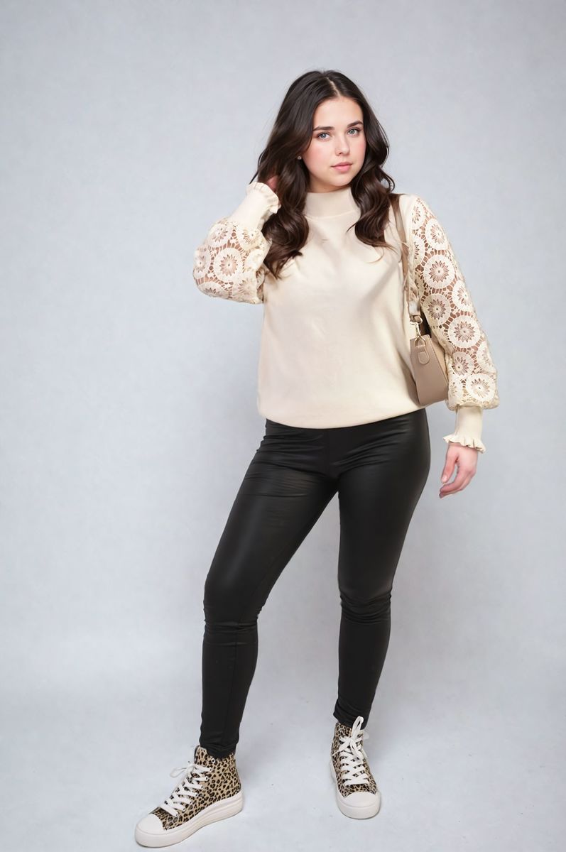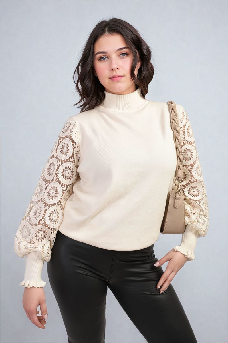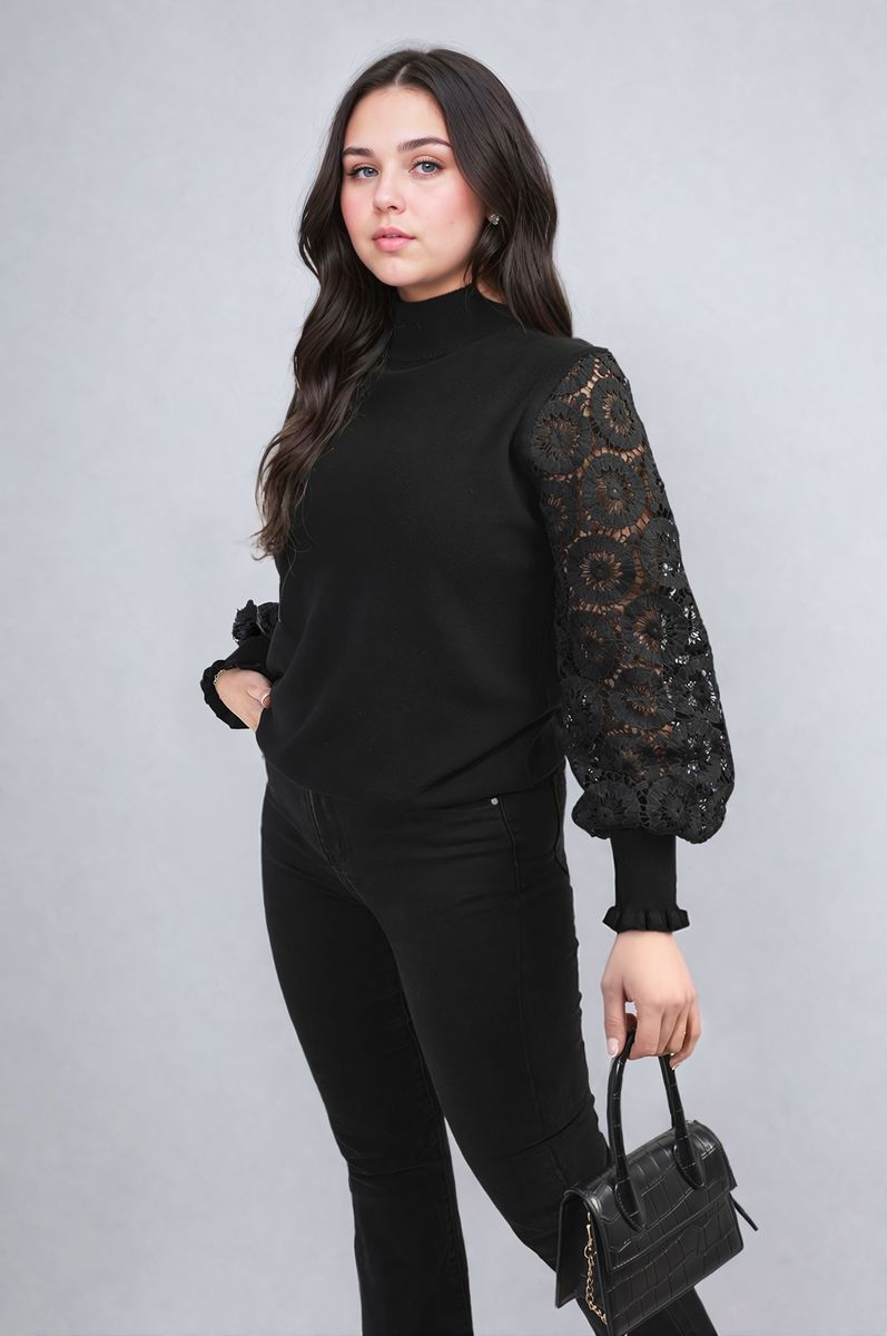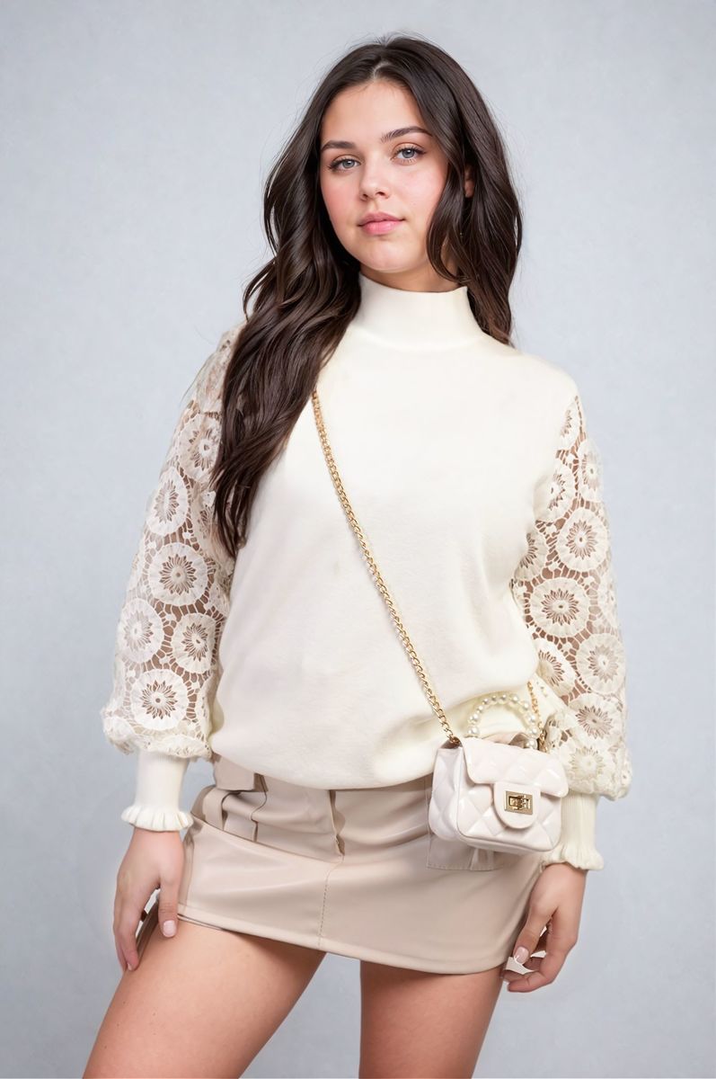 Get cozy in the Alexis High Neck Knit Crochet Sleeve Jumper! This stylish jumper features a chic high neck and beautiful crochet sleeves, perfect for adding a touch of elegance to your look. It's your go-to for staying warm and trendy, making it easy to turn heads wherever you go.
