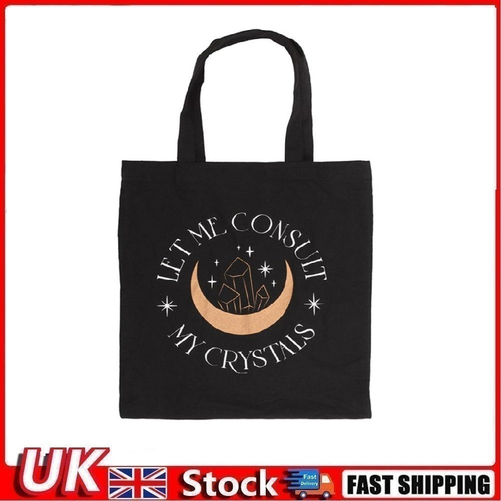 This trendy cotton tote bag is a fun and unique gift for any crystal collector or for anyone to stay in touch with their mystical side. Featuring "Let me consult my crystals" text accented by a gold crescent moon and crystal design on black cotton canvas. Includes ample space for sustainably carrying everyday essentials, crystals, or for shopping.