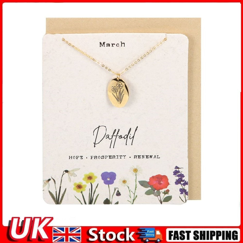 This lovely greeting card features a timeless wildflower design and holds a gold-tone necklace adorned with the recipient's birth flower, making it a thoughtful surprise for birthdays, Mother's Day, milestone moments and more. Symbolising hope, prosperity and renewal, the daffodil is a meaningful token for those born in the month of March. Includes engraved flower charm on a 22cm nickel-free chain. Card left blank inside. Envelope included.