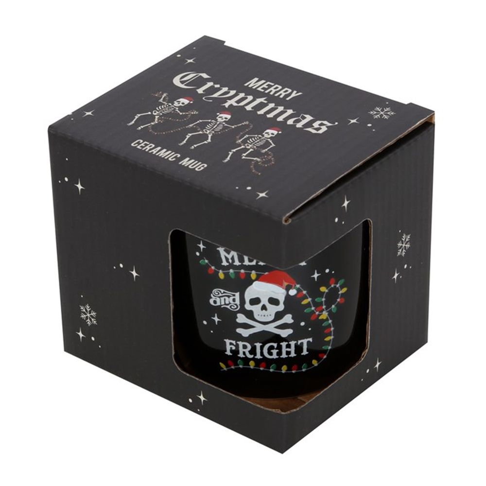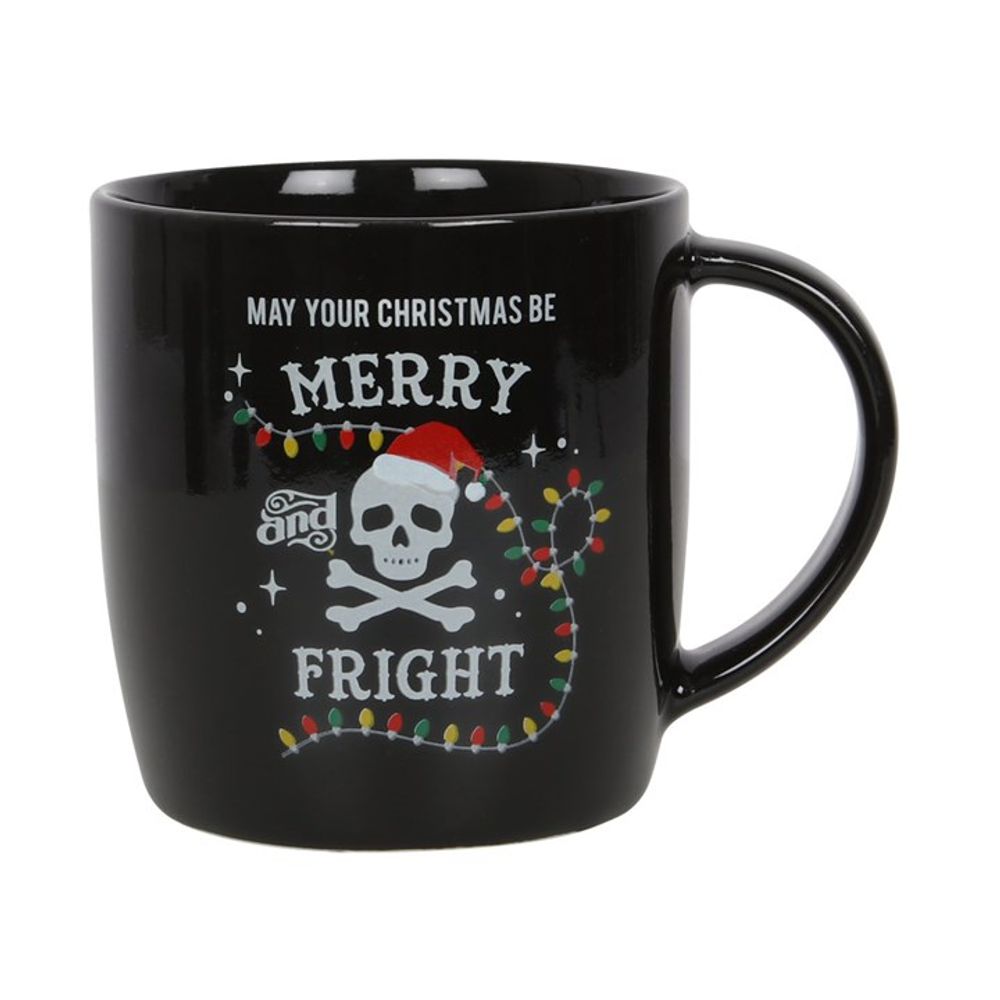 Tis the season for all things festive, even for those a little less traditional than most. This brilliant and unusual gothic mug features a festive skull and crossbones design with the text 'May your Christmas be merry and fright'. 500ml capacity. Dishwasher and microwave safe. Product Dimensions: H9cm x W12cm x D8.6cm Packaged Dimensions: H9.7cm x W11cm x D9cm