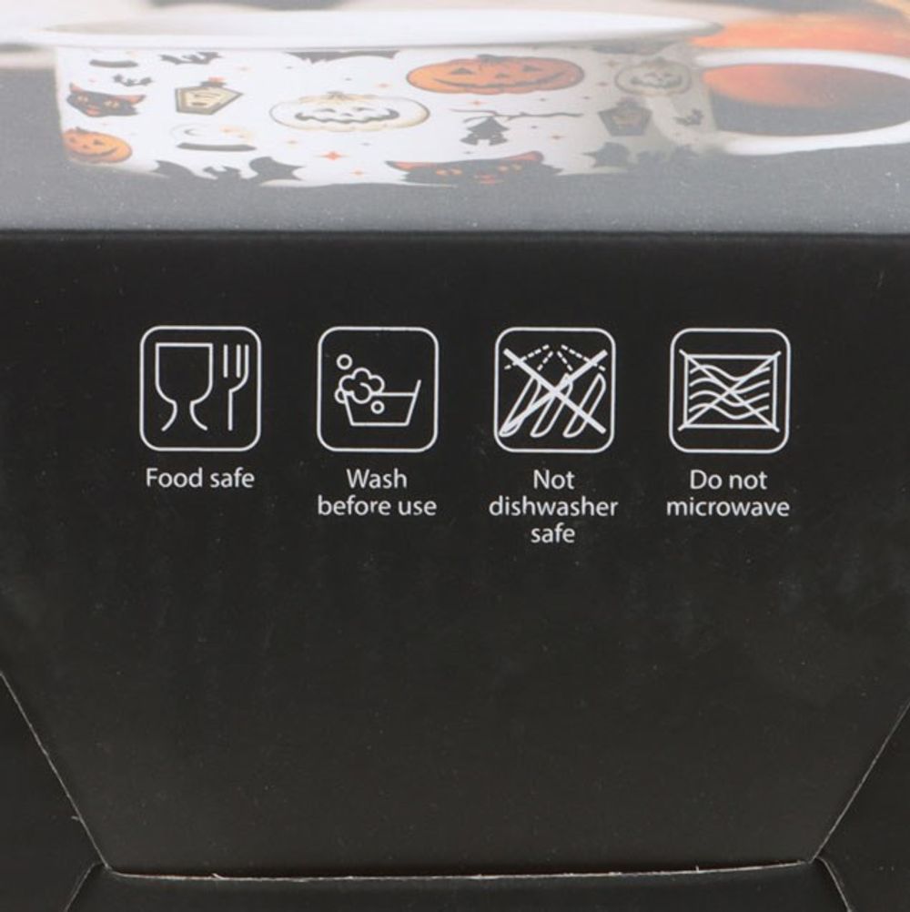 Get in the spirit of Halloween with this chunky ceramic mug featuring vintage inspired Halloween motifs like black cats, bats, potion bottles and jack-o'- lanterns. 480ml. Microwave safe.