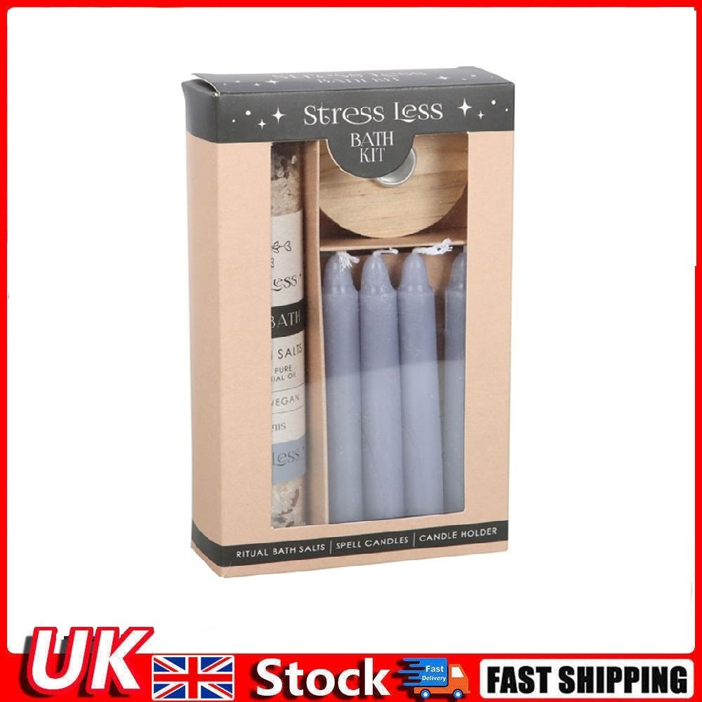 Create a sacred space to alleviate stress and promote relaxation with this Stress Less Ritual Bath Kit. The kit features bath salts made from the finest Himalayan salt and infused with the comforting aroma of jojoba essential oil to provide a blissful bathing experience that nurtures both your body and soul. Himalayan salt carries natural energy to restore balance, while jojoba helps calm the mind and promotes feelings of relaxation. Use the purple spell candles and wooden holder as part of your bathing ritual by visualising a goal, lighting a spell candle, and manifesting the end result while indulging in a relaxing bath.